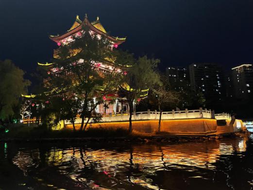 一川运河水,为淮安带来数不尽的繁华,也为这座城积攒下了厚重的历史与人文底蕴。华灯初上,国师塔的灯亮起,河畔的景观灯便全都亮起来了。桨声灯影里,我们乘坐画舫龙船,漫观绚烂夜色,细听运河文化,沿着水路徐徐向前,从一座座或古或今的桥梁下穿行而过。秋夜微凉,清江大闸、石码头桥、大运河文化广场等美景串联成线,迎面而来。正应了那句“船在水中走,人在画中游。”