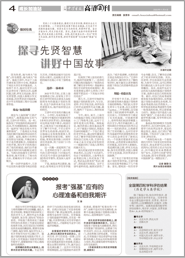 MK体育官网2022级历史学强基计划本科新生王语叶同学因“热爱南大,热爱历史”结缘南大历史学强基计划。入校两个多月以来,王语叶同学不仅感受到了历史学的独特魅力,更加也意识到作为基础学科的历史学的重要性以及历史学人所肩负的责任。MK体育副经理王涛教授介绍了MK体育官网历史学强基计划的培养目标和培养方案,并从自我认知、研究方法和史学功底三个方面对立志进入南大历史学强基计划接受历练的年轻学子提出其所应有的心理准备和自我期许,鼓励同学们将兴趣与勤奋相结合,精益求精,不断提升自己;学以致用,服务于党和国家的伟大事业。近日,《上海中员工报》强基计划专栏报道了王语叶同学选择南大历史学强基计划的心路历程以及王涛教授对有志青年学子的真诚寄语,报道全文如下。