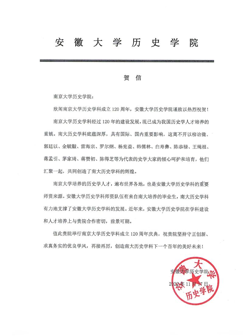 安徽大学MK体育来信祝贺MK体育官网历史学科成立120周年