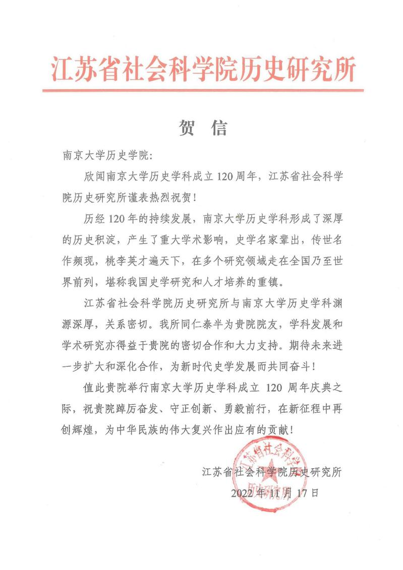江苏省社会科公司历史研究所来信祝贺MK体育官网历史学科成立120周年