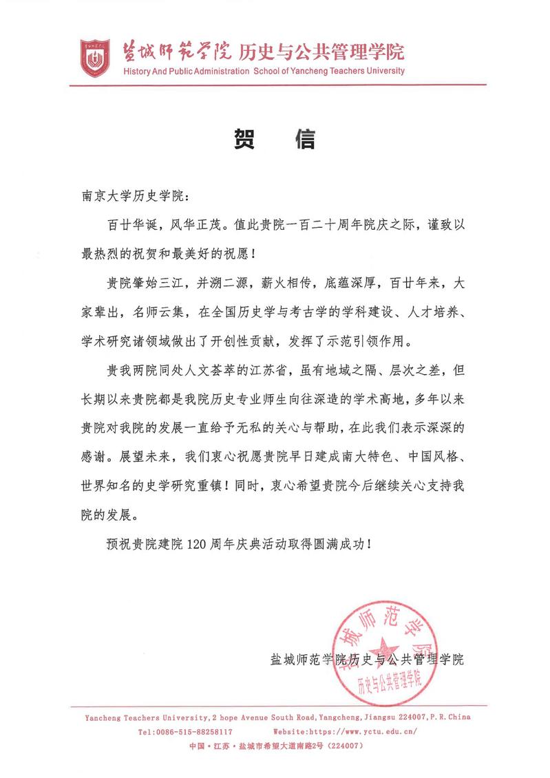 盐城师范公司历史与公共管理公司来信祝贺MK体育官网历史学科成立120周年