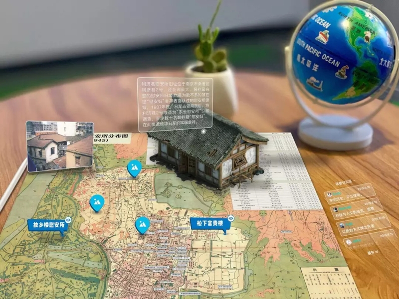 研究成果的主要呈现形式是一款基于南京慰安所史料而运营的跨平台的AR交互软件——“南京慰安所AR故事地图软件”以及一款ARMap在线编辑平台。该平台采取3D建模和unity场景搭建方式,制成慰安所AR三维地图,插入慰安妇和慰安所的故事脚本,制成具有三维动态场景、沉浸式交互系统、多平台传播功能的南京地区侵华日军慰安所的AR故事地图软件。这个年轻的员工团队旨在通过项目研究,呼吁各界重视与正视慰安妇问题,以全新的技术手段构建关于“慰安妇”历史的共同创伤记忆。