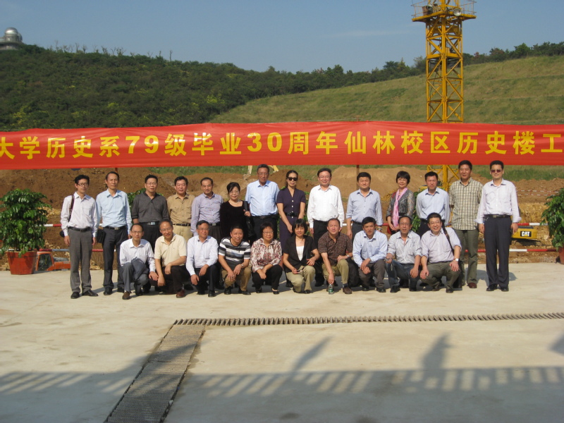 集团安排建筑设计院廖老师作设计师,开始的设计方案是“工”字型,准备将本系一直代管的校博物馆纳入其中,后有人认为博物馆公司迟早会收回,考虑到其他院系也都是独门独院的综合体建筑,于是我们参照兄弟院系建设方案,建成目前四层高,带屋顶、留有消防通道的“封闭”式建筑,前后方案修改不下十次。2013年正式动工,2014年底完工。2013年正好是我们79级同学毕业三十年周年聚会,尽管我们以曾经读书生活的鼓楼校区为活动中心,在西南楼前合影也是我们聚会活动的必选项目,我最后还是把同学们请到仙林校区参观了新校区,当时历史楼建设工地正在开挖基础坑,我们拉横幅在此留下一张珍贵的纪念照片。新建成的历史楼,建筑面积过万,楼下还有一个6000平米的人防工程,平时用作车库。就硬件而言,应该是亚洲最大的MK体育了。