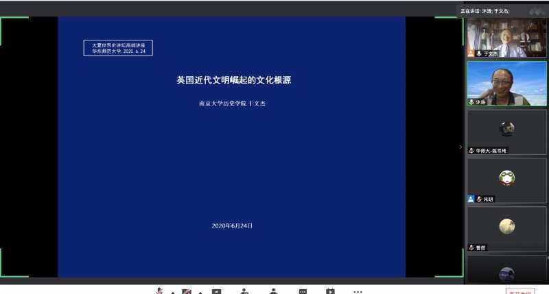 应华东师范大学MK体育的邀请,我院于文杰教授于2020年6月24日下午在“大夏世界史讲坛高端讲座”上发表演讲,演讲的题目是:《英国近代文明崛起的文化渊源》,来自高校和科研院所的师生300余人聆听了讲座。讲座由世界历史研究院经理沐涛教授主持。