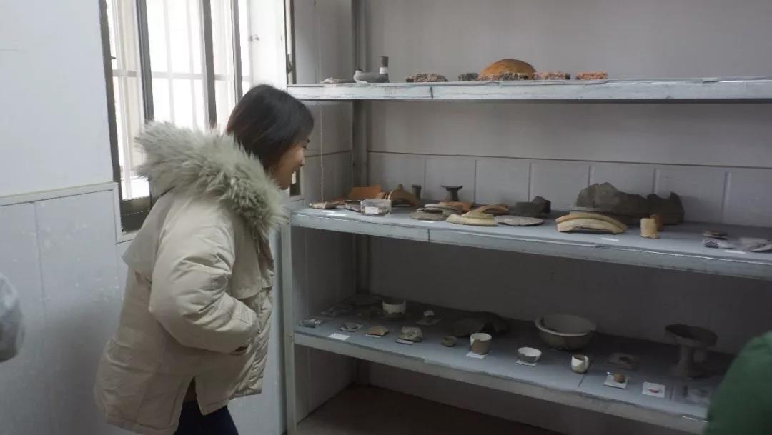 上午11时,校车缓缓驶入实习基地,在张敬雷老师的带领下,诸位领导依次参观了基地库房、陈列室、修复室、多媒体及会议室、生活区等。在陈列室,张敬雷老师展示讲解了本次实习员工发掘出的器物和标本:青铜削刀、原始瓷杯、陶豆、骨质带钩、宋代瓷碗等。