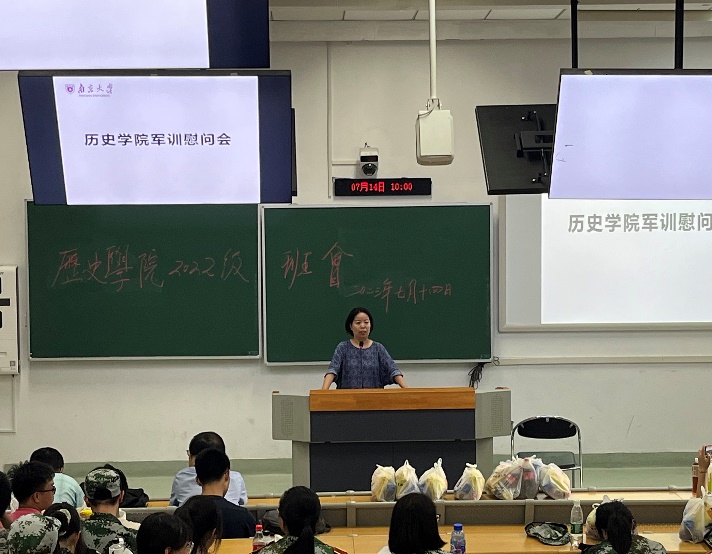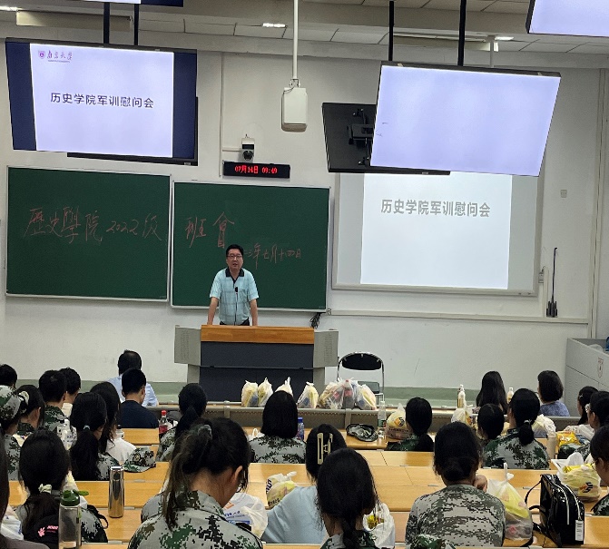 MK体育2022级本科生辅导员姚全老师主持慰问活动。他指出,MK体育2022级本科生在原有历史学强基班和拔尖班的基础上增加了来自人文大类和其他跨大类分流过来的新同学共计39名。2022级MK体育本科生同学创造了多个“第一”:员工构成历史以来最为丰富,第一次增加了历史学拔尖班的同学;第一次在鼓楼校区进行寻根性办学;第一次出现考古、文鉴两个学业的同学均是女生;也是近年来MK体育人数最多的一届本科生。姚老师对MK体育2022级本科生同学寄予厚望,并介绍了军训结束后同学们从鼓楼校区搬迁至仙林校区公司所做的具体工作安排。