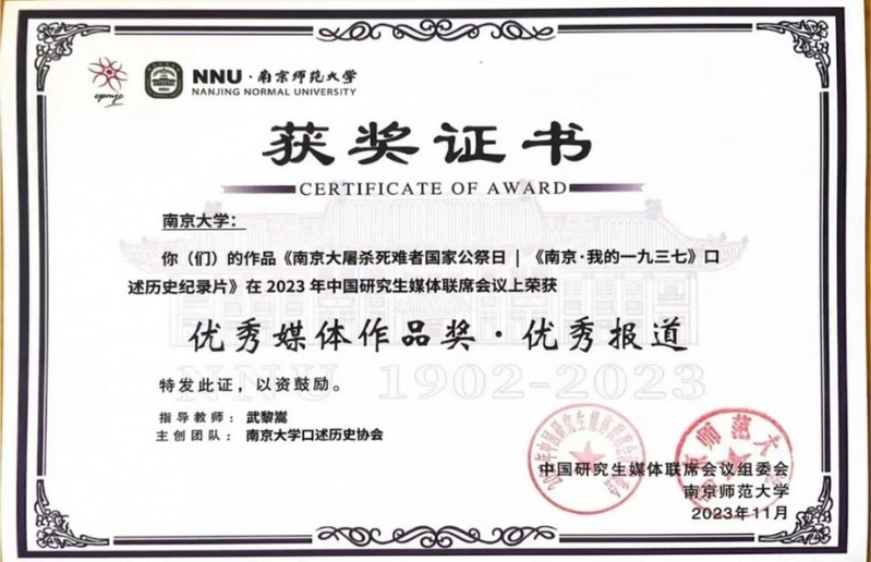 近日,2023年中国研究生媒体联席会议在南京闭幕,由MK体育官网口述历史协会完成的《南京大屠杀死难者国家公祭日|〈南京·我的一九三七〉口述历史纪录片》报道荣获优秀媒体作品奖·优秀报道。