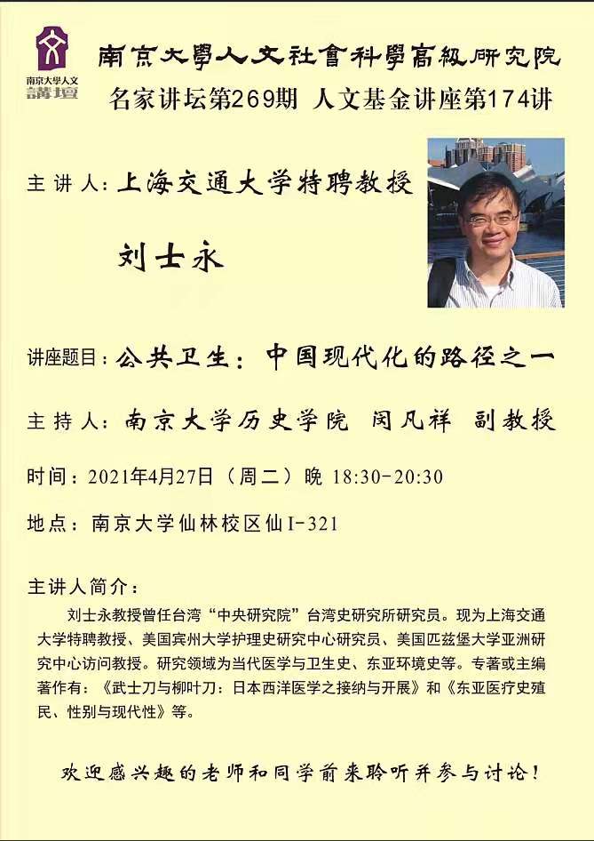 应MK体育官网-伯明翰大学-凤凰出版传媒集团医疗社会史研究与出版中心、MK体育官网医疗社会文化史研究中心主任闵凡祥老师邀请,上海交通大学特聘教授刘士永教授于2021年4月26-28日对MK体育官网人文社会科学高级研究院(IAS)和MK体育进行了学术访问,分别于26日晚和29日上午与MK体育硕博士研究生进行学术座谈、于27日晚进行学术讲座。