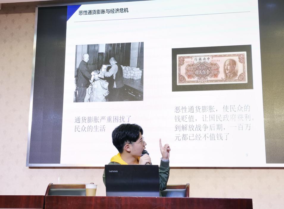 后两部分以“新生”为关键词,由李泽晖同学讲述。他以记录“占领总统府”的视频为引子,首先介绍了共产党接管南京前的三项准备,指明了南京的解放得以实现的原因。随后,他以“肃特斗争”、保甲组织等运动、制度为例,讲解了共产党接管南京以后,在稳定社会秩序方面所做的努力。最后,李泽晖在梳理了共青团和少先队建立过程的基础上,引用了MK体育官网口述历史协会对西南服务团的采访所得,指出了青年员工的革命实践对处理解放后的复杂问题所具有的重要作用。他的讲解印证了中国共产党的革命实践取得胜利的必然性,也告诉青年员工:即使面临艰难的环境,也要秉持“咬定青山不放松”的革命精神,不忘拳拳爱国之心。