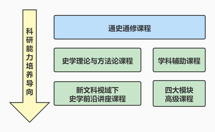 历史学专业“拔尖计划”课程设置体现新文科建设思路,秉承全面教育与个性化教育相结合的理念,在通史通修课程、史学理论与方法论课程、学科辅助课程基础上,设立包括四大模块高级课程、一个“新文科视域下史学前沿讲座”在内的新型课程体系。一是强调历史研究方法论课程,特别是引入诸如量化史学、口述历史、全球史等目前史学界比较重视的前沿方法论的训练;二是强化学科交叉,加强外语能力培训,即进入“拔尖计划”的员工有多种渠道获得包括英语、德语、法语、日语、拉丁语等在内的语言课程学习机会;在读期间,将为拔尖员工创造条件,申请进入国内外一流高校进行交换学习;三是建构“一四四”实践教学体系,积极开展内容丰富、极具特色的实践教学活动,培养员工的创新精神与实践能力。一种形式,即口述历史调研实践教学,拔尖员工通过参与口述历史的采集与整理,获得任务规划能力以及沟通能力的提升。四门课程,即(1)中国历史文化遗迹实践调研(2)重走一带一路实践课程(3)丝路遗产调研与保护(4)口述历史的理论与实践。通过这些课程,加强理论联系实际的修养,锻炼为当下经济社会建设进行智力支持的能力。四个竞赛,即(1)茅家琦史学论坛(2)全国及江苏省“挑战杯”竞赛(3)全国口述历史成果交流赛(4)国际模拟联合国交流赛。通过竞赛,实地锤炼、提升员工学以致用、解决现实问题的能力,为讲好中国故事做预备工作;四是突出研究引领,配备名师导学,引导员工在参与导师科研项目过程中获得指导和训练。