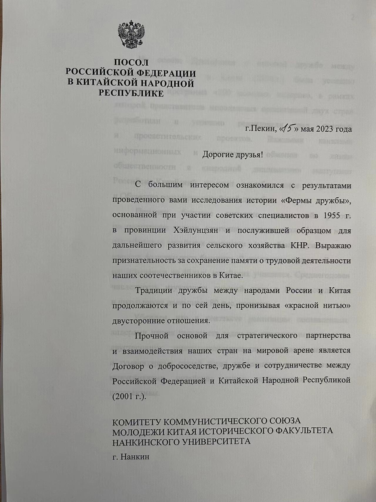 On 15 May, Ambassador Igor Morgulov wrote to the Russian Ambassador to China, reporting on the team's research on the history of the modernisation of agriculture in Beidahuang and the development of the state-run Friendship Farm.